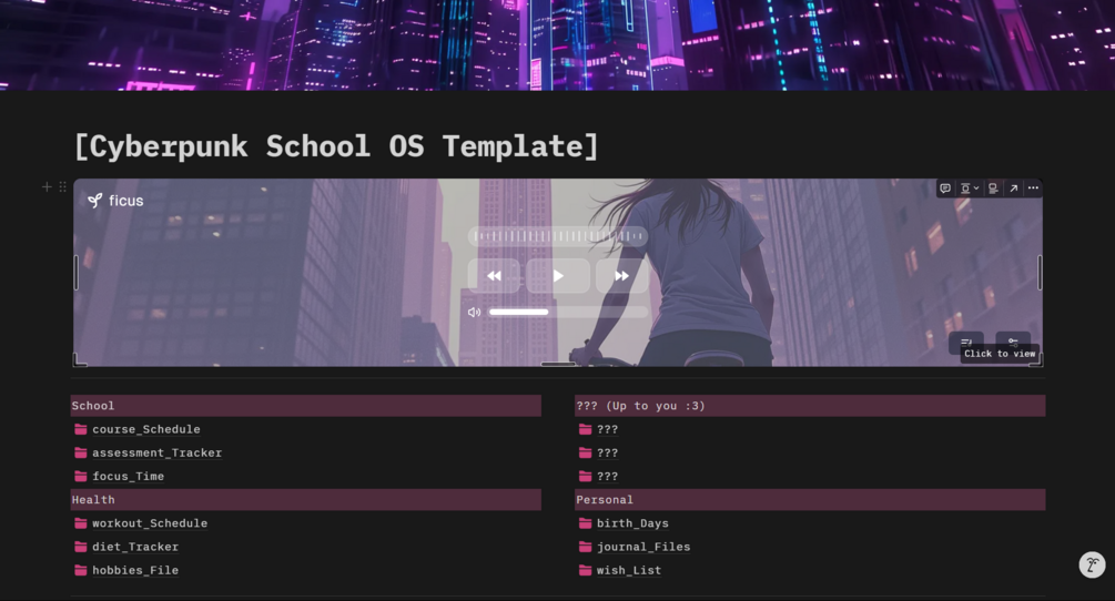 A cyberpunk themed aesthetic notion template with all your needs! Whether its for school, health, personal or other needs, you can organize them right here. This template has: